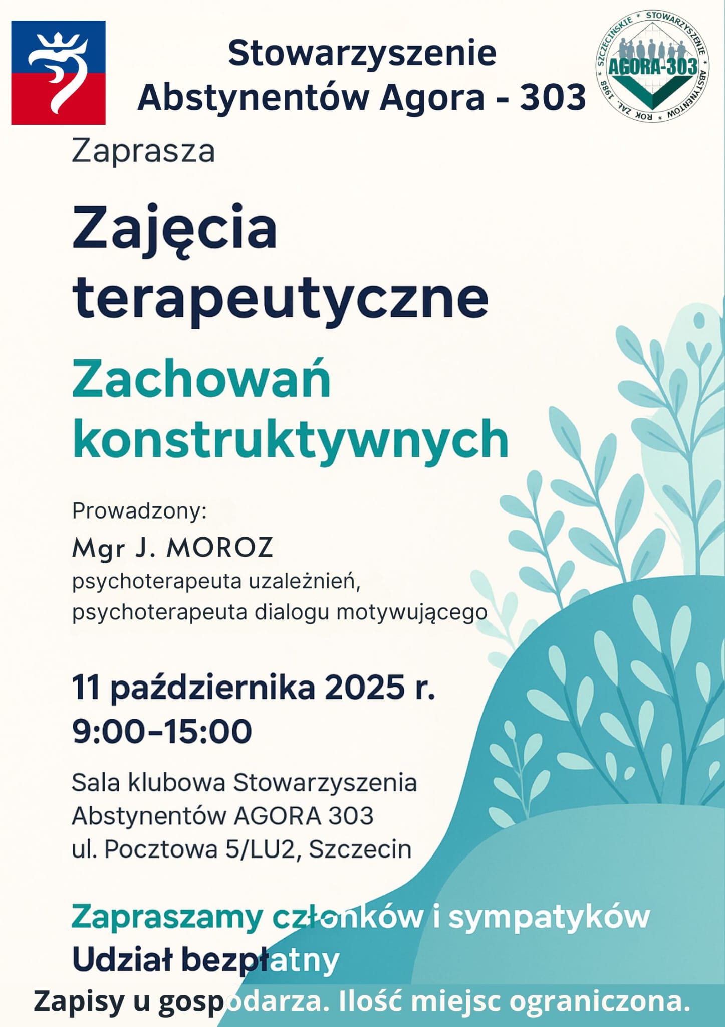 Zapraszamy do udziału w wyjątkowych zajęciach terapeutycznych prowadzonych przez mgr Jerzego Moroza, doświadczonego terapeutę uzależnień. Spotkanie poświęcone będzie tematowi zachowań konstruktywnych, które stanowią fundament zdrowienia i budowania nowego życia w trzeźwości.